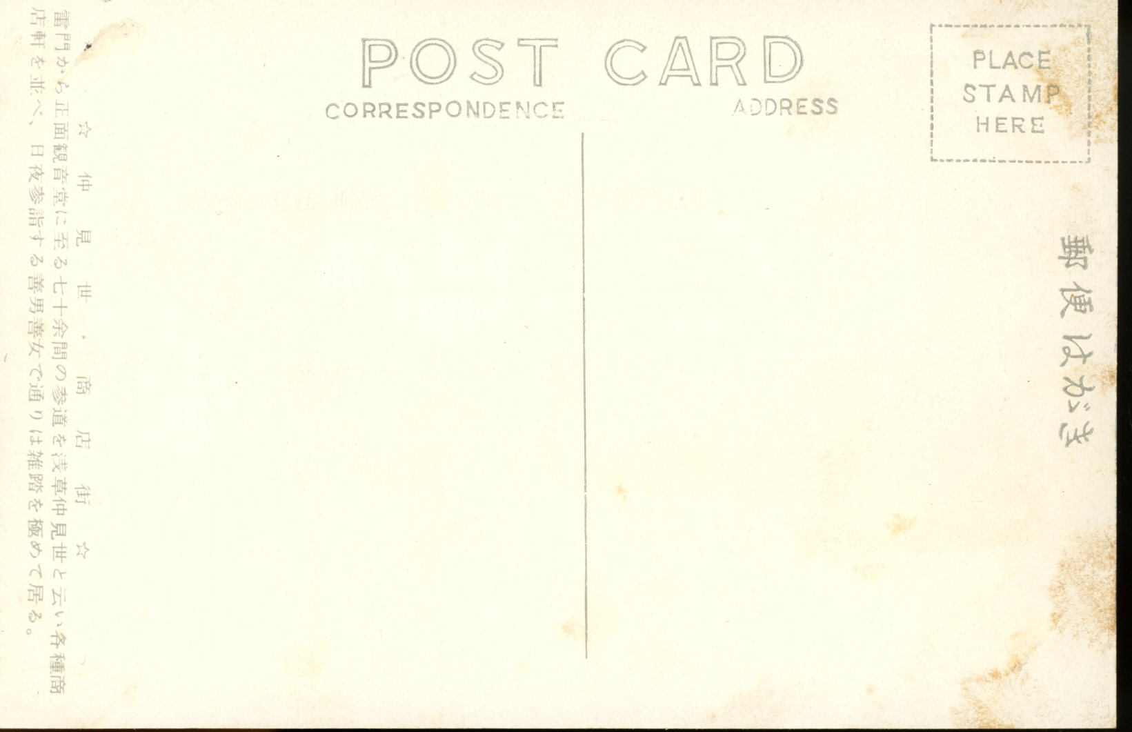 Japanese (trans.) Nakamise/ Shōten-gai: Along the appraoch of over 70-ma from Kaminari-mon to the front entrance of Kannon-dō, there are various so-called nakamise shops, existing amongst the hustle and bustle of men and women visiting the temple day and night.